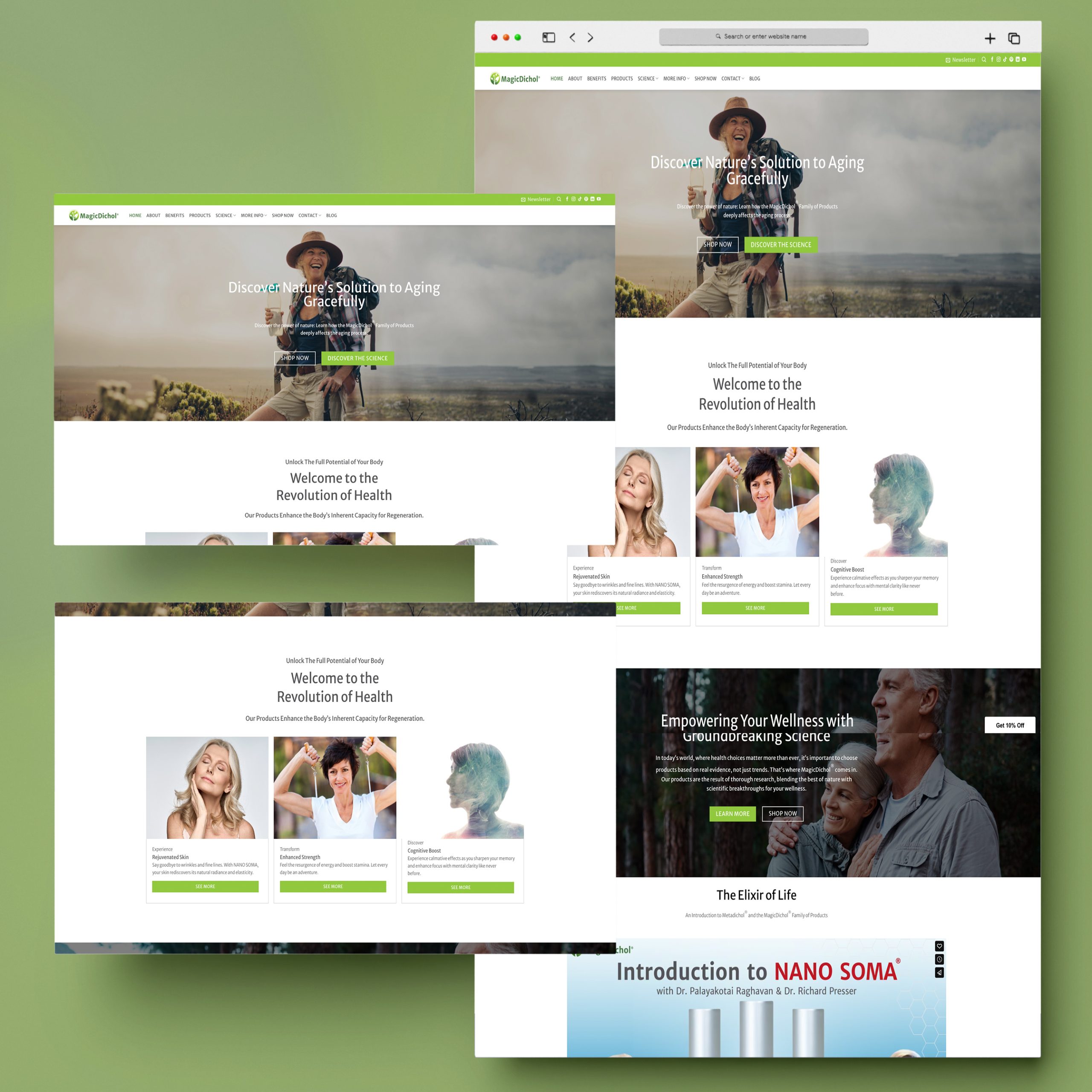 MagicDichol®, a health and skincare brand powered by the breakthrough ingredient Metadichol®. We helped build a clean, conversion-focused website that educates, engages, and builds trust. Designed on WordPress, the landing page features a CTA-driven layout, a clear split between health and skin products, and a minimalist design that balances science with simplicity, laying the groundwork for a scalable, content-rich eCommerce experience.
