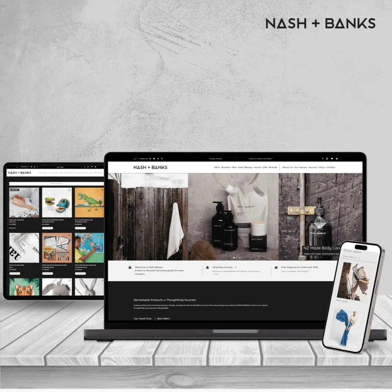 Nash + Banks is a purpose-driven gifting store that curates meaningful, artisan-made products with a positive impact. We partnered with them to build a Shopify store that beautifully reflects their brand values. With a custom-designed theme, mobile-first layout, flexible payment options, and enhanced product storytelling, the result is a refined shopping experience that inspires connection and conscious giving.